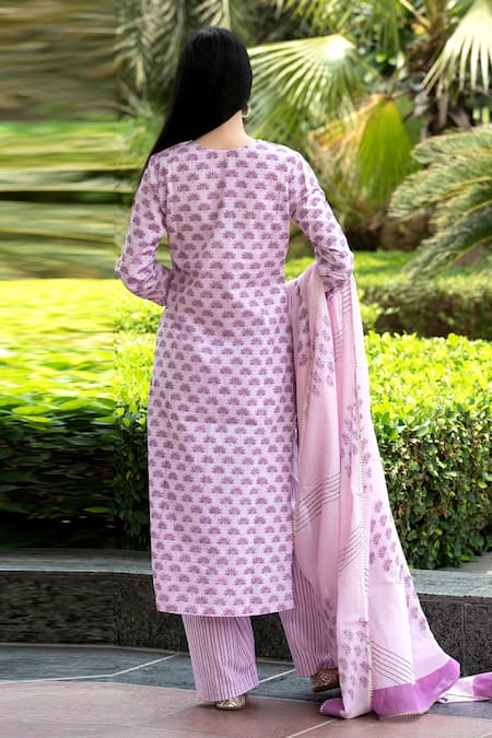 Purple Cotton Cambric Dupatta Mulmul V Neck Hand Block Print Kurta Set