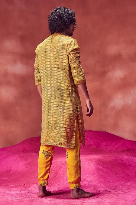 Yellow kurta with hand block print in a wave pattern and zip closure in front. Comes with joggers.