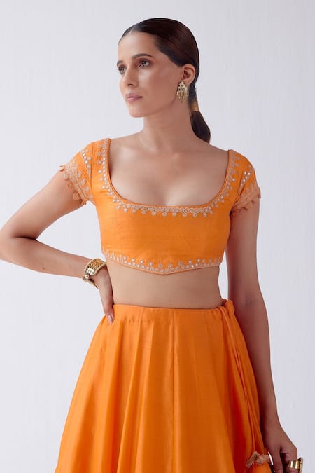 Orange Chanderi, Raw Silk And Organza Dori, Sequins Hand Block Print Lehenga Set