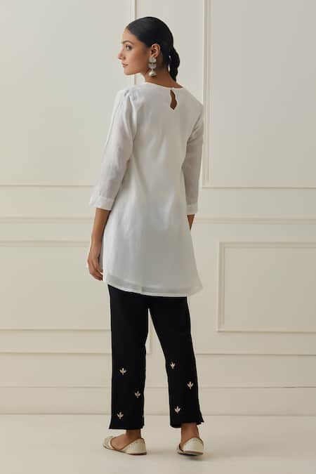 Off-white chanderi silk A-line kurta featuring dull gold pittan hand embroidery on the neckline. Paired with black cotton flax pants with decorative embroidery details.