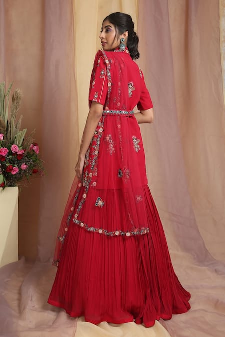 Red jacket with floral embroidered motifs in cutdana & resham work. Paired with pleated ruffle hem lehenga & cutwork hem dupatta. Comes with heart-shaped belt bag.
