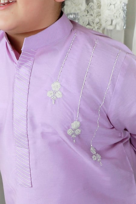 Purple kurta featuring hand embroidery on one shoulder and a band collar. Paired with matching pants for a complete look.
