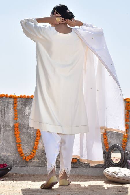 White Kurta Tussar Pant Satin Dupatta Hand Embroidered Set