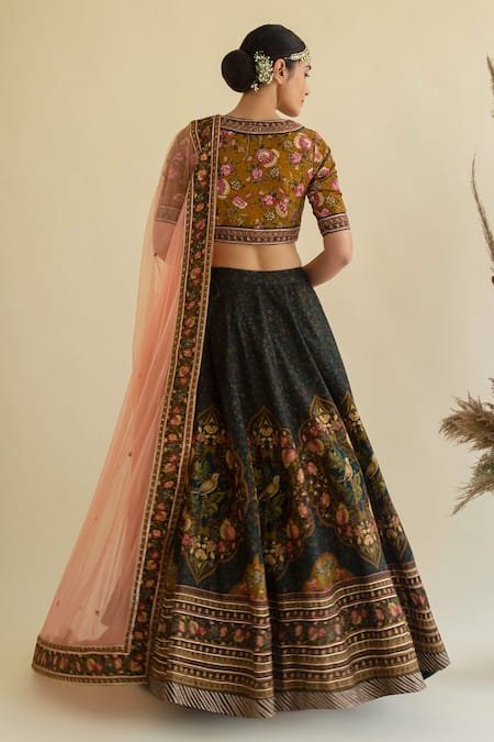 Deep emerald green lehenga with floral, bird printed & hand embroidered motifs. Paired with embroidered blouse & dupatta.