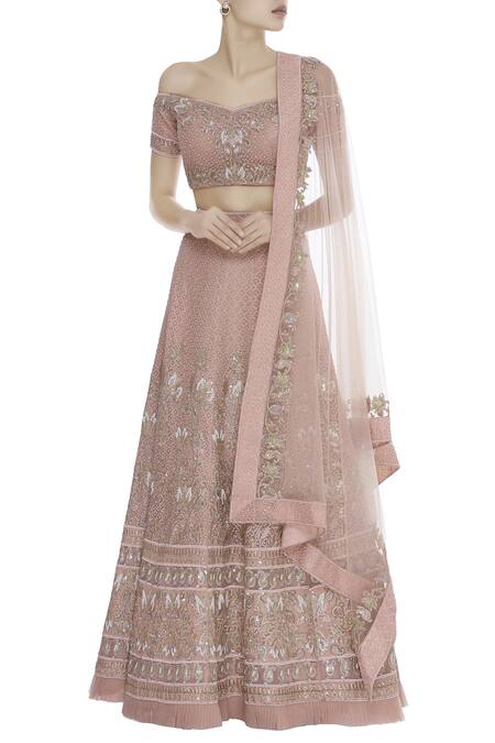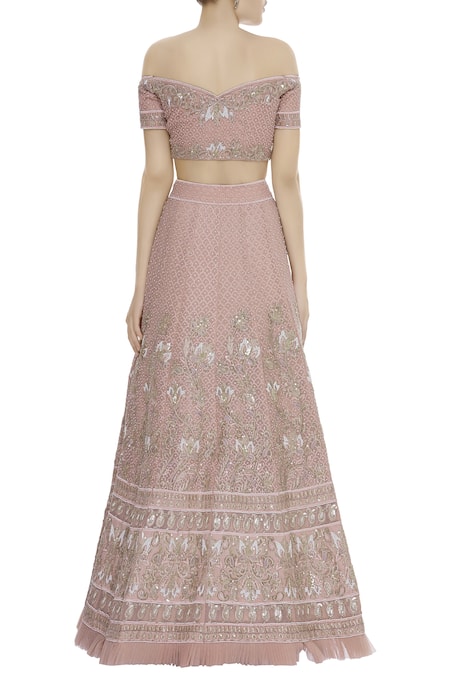 Pink Hand Embroidered Off Shoulder Blouse And Lehenga Set