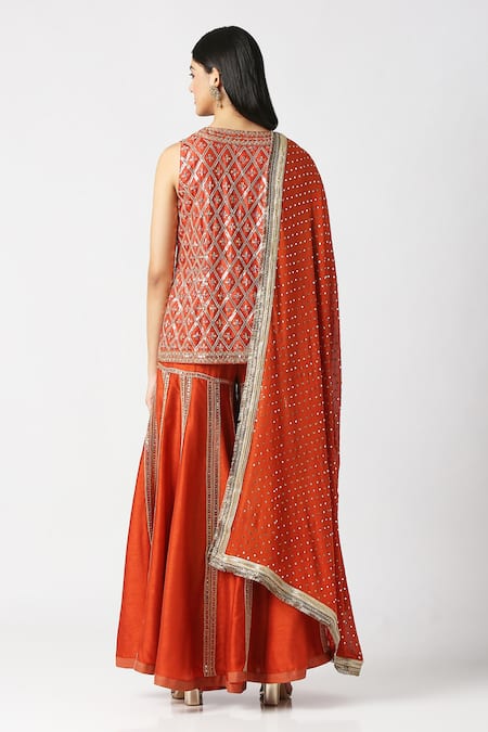 Orange Kurta Pure Silk Hand Embroidered Marodi Notched Sharara Set