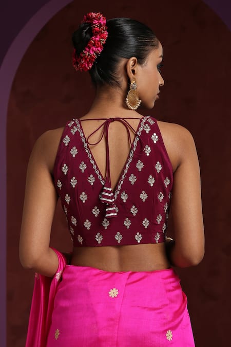 Wine blouse featuring hand embroidered zardozi floral motifs and a V neck