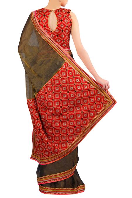 A contemporary saree with an old world charm is this green banarasi tissue saree comes with hand embroidery. It is teamed up with red silk sleeveless blouse.