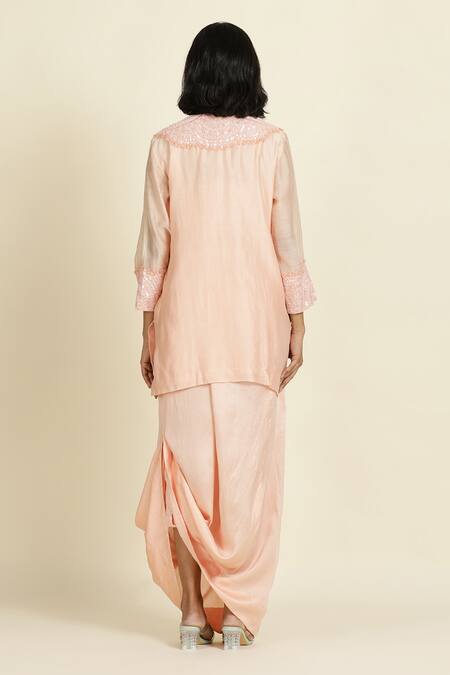 Buy_Oshi By Shikha_Pink Silk, Chanderi, Muslin Hand Embroidered Short Kurta And Draped Skirt Set_at_Aza_Fashions