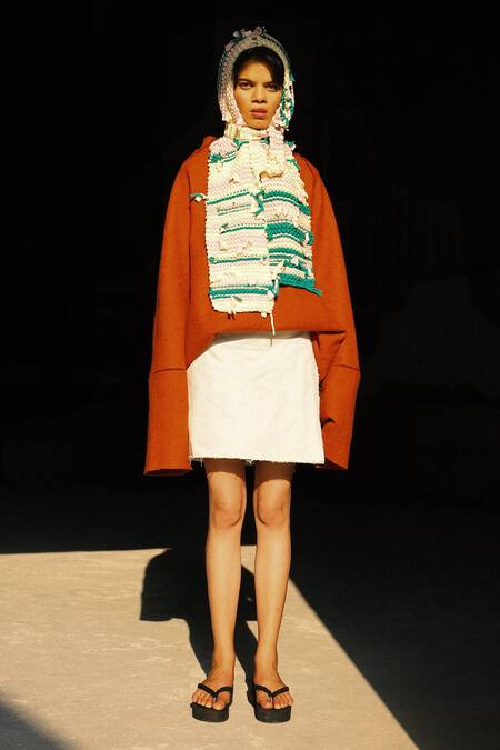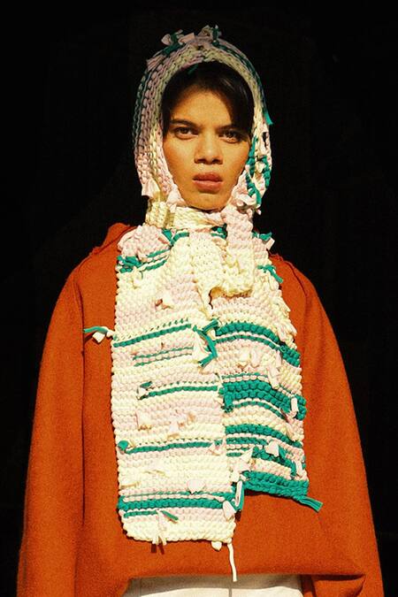 White scarf featuring hand-knitted and knotted details