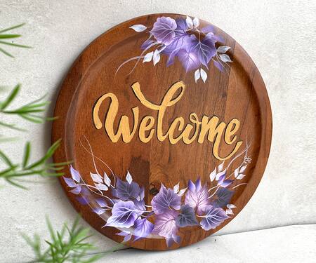 Brown handmade acacia wood circular-shaped wall plate with hand painted purple-tone ivy floral motifs, 'Welcome' calligraphy detail, lead-free coating & water based top coat.