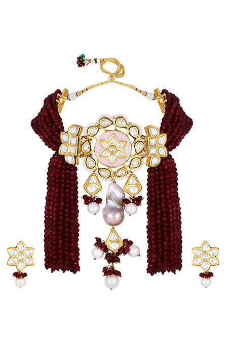 Hand-painted meenakari work on choker, Kundan polki embellishments, Floral design earrings with pearl drops
