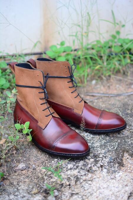 Brown, burgundy Balmoral boots with waxed laces & stack heels.