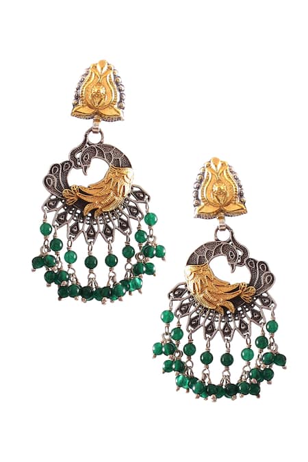 3D peacock motif carvings, Lotus top design, Tiered green bead drops