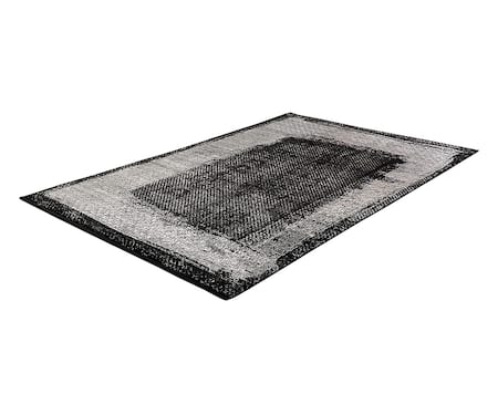 Black-beige rectangular-shaped woven carpet with geometric motifs & cut pile finish with embossed pattern.