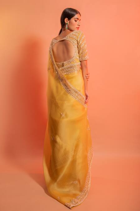 Blossom yellow saree highlighted with bugle bead handcrafted embroidery & cutwork hem. Comes with leaf neckline blouse & satin petticoat.