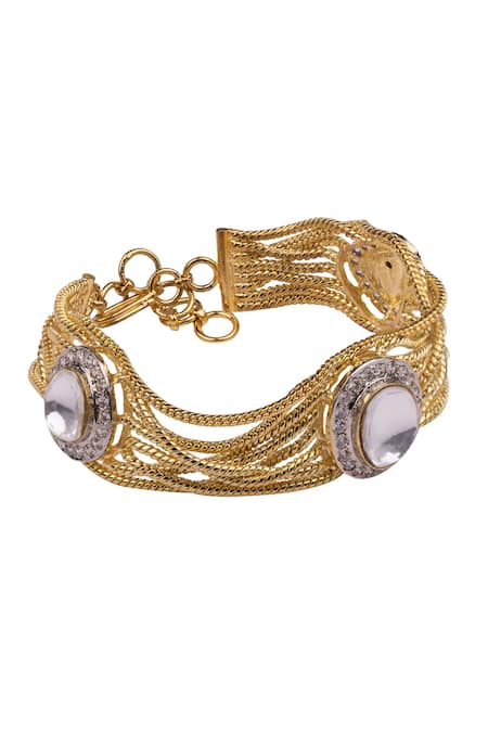 Gold tone bracelet featuring entangled wires with kundan and American diamond stone embellishments