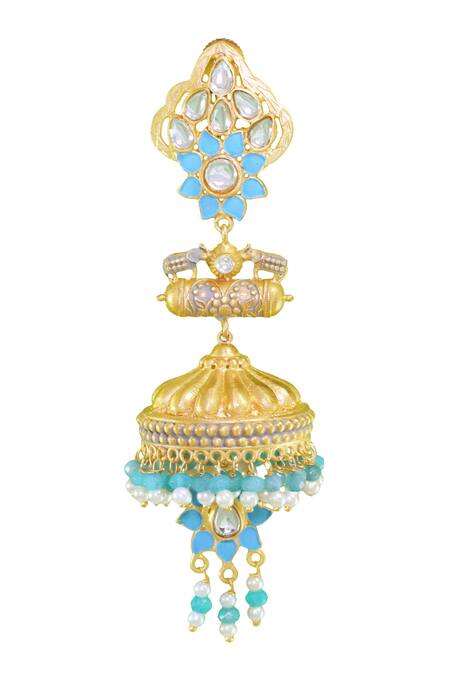Gold jhumkas featuring blue enamel detail and a floral motif top