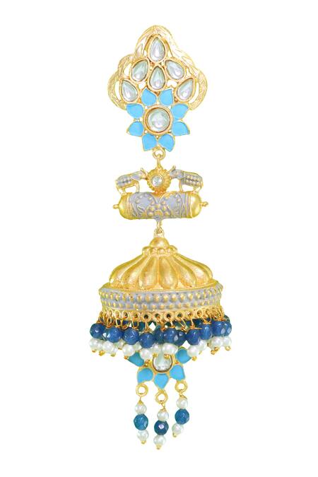 Floral motif top with enamel detail, Cluster bead drops with pearl accents, Carved detailing on jhumkas
