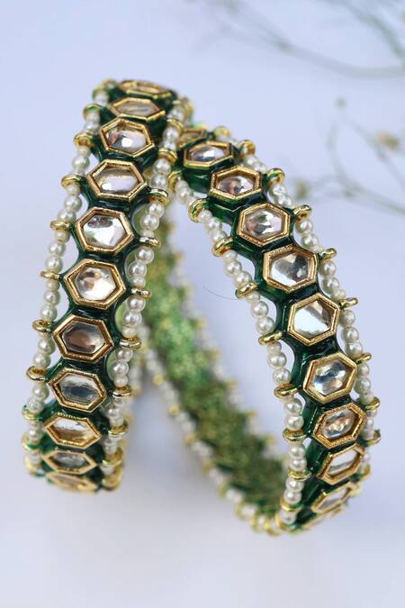 Gold-plated bangle with geometric motifs, encrusted kundan, green enamelling & embellished two-string pearl edges.