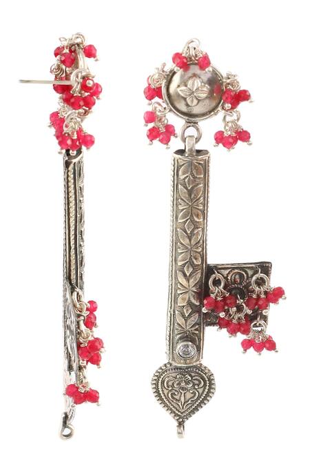 Floral carved motifs on the danglers, Cluster red bead drops, Oxidized silver finish