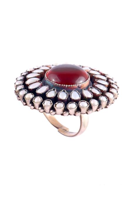 Teardrop pearl set in a circular design, Red gemstone centerpiece surrounded by pearls