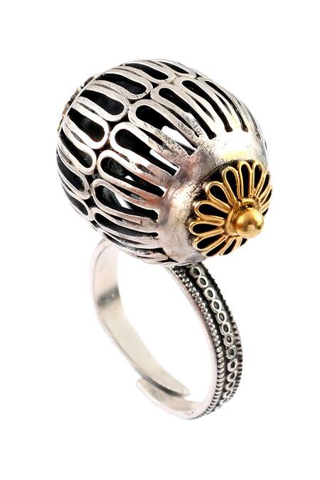 Gold plated silver tone adjustable ring featuring rawa work and carved design