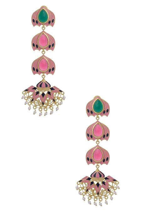 Gold-finish long earrings featuring pink enamel detail and stone embellishment