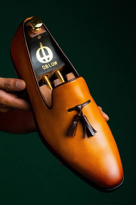 Tan loafers with tassel detail, patina finish & hand-dyed.