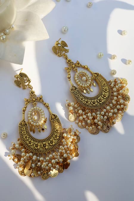 Geru gold plated chandbalis with temple work, 3D bird motif top, carved detail & shell pearl-coin drops.