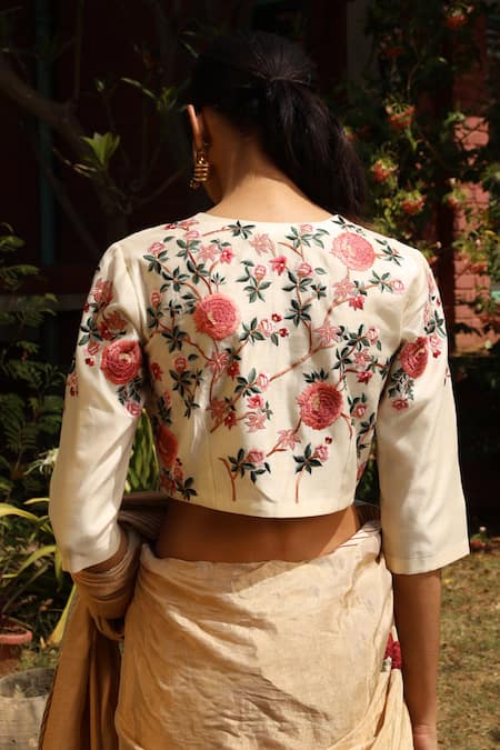 Cream kora silk handloom chanderi blouse with floral embroidered motifs & notched neckline.