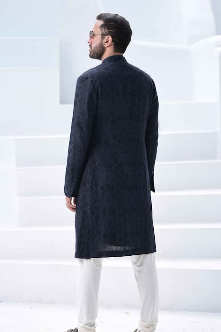 Navy blue front-open jacket with geometric cross-stitch embroidered motifs. Paired with silk viscose kurta & churidar.