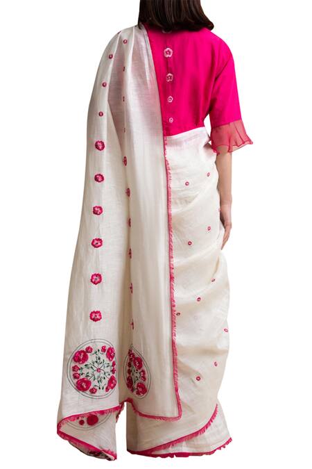 A refined sobriety is captured in this radiant ivory toned saree fabricated in the rich handloom linen. It is adorned with charming floral embroidery at thoughtful placement and detailed with frayed border.