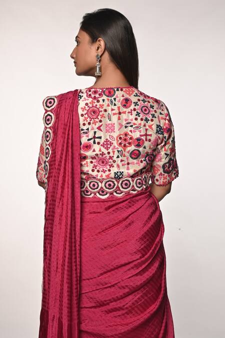 Buy_Soumodeep Dutta_Fuchsia Silk Embroidery Round Neck Handloom Border Saree With Blouse_Online_at_Aza_Fashions