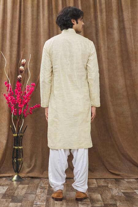 Beige handloom silk kurta with floral embroidered placket. Paired with off-white salwar.