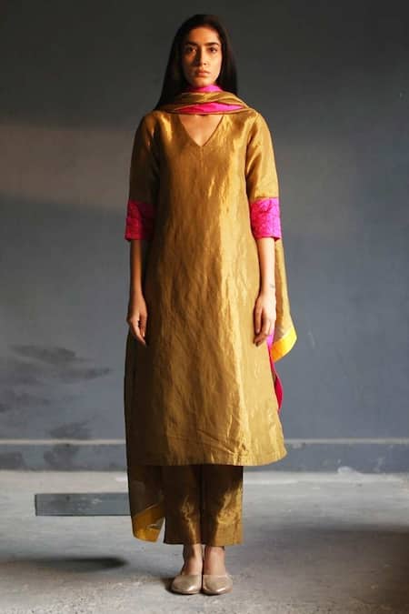 Antique gold straight long tissue kurta with contrast panelled sleeve hem & placement hand embroidery. Comes with pants.