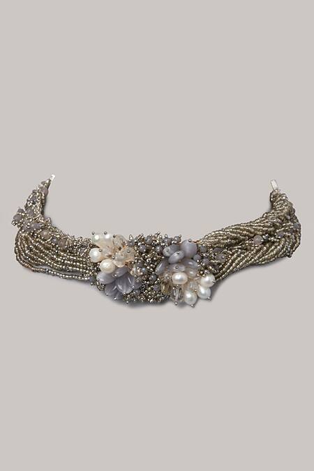 Grey handmade choker with twisted strings strewn with beads. Comes with studded earrings, embellished bracelet and a ring.