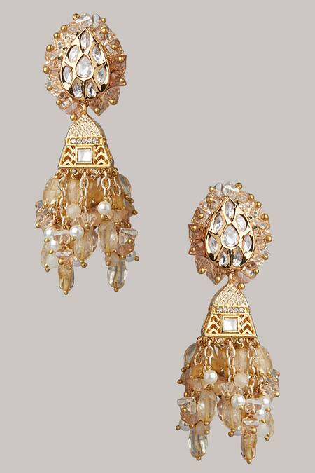 Gold toned handmade jhumkas with pink stone tassels.