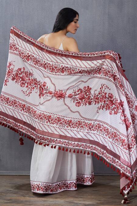 White handwoven Chanderi dupatta with red-tone floral motif print, sheer silk organza panel & tassel border.