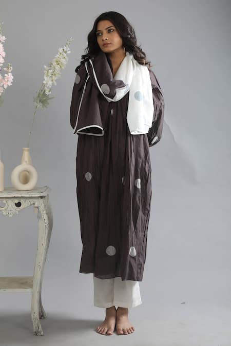 Brown kurta featuring polka patterns in handwoven cotton, complemented by a contrasting pant. The set includes a colorblock scarf with polka detailing.