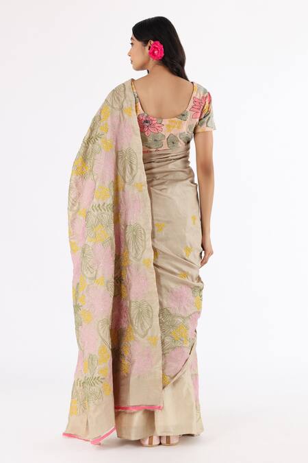 Grey handwoven silk saree featuring lotus pattern thread and sequin embroidery. Paired with a round neck blouse with all-over embroidery and half sleeves.