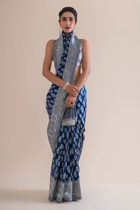 Buy_Ekaya Banaras_Blue Handwoven Silk Saree_at_Aza_Fashions
