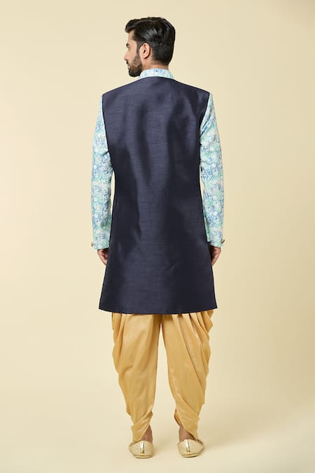 Blue two tone attached jacket kurta featuring floral base pattern with sequin and thread work. Paired with a gold peshwari dhoti pant for a complete look.