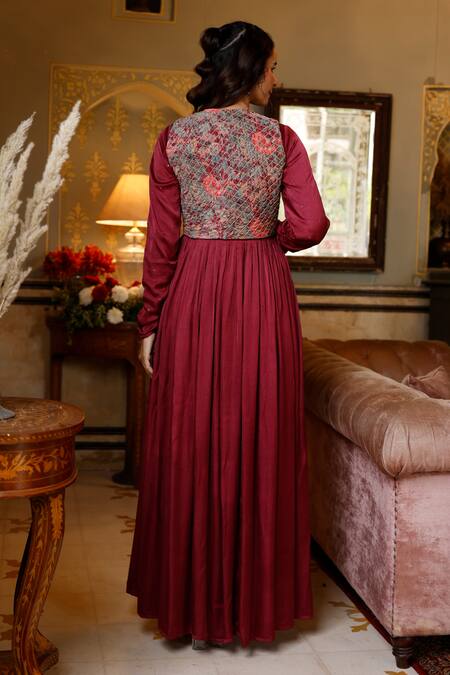 Wine Anarkali featuring full sleeves, round neckline, and pleated flare. Paired with a hand embroidered flower print koti jacket adorned with mirror and thread work.