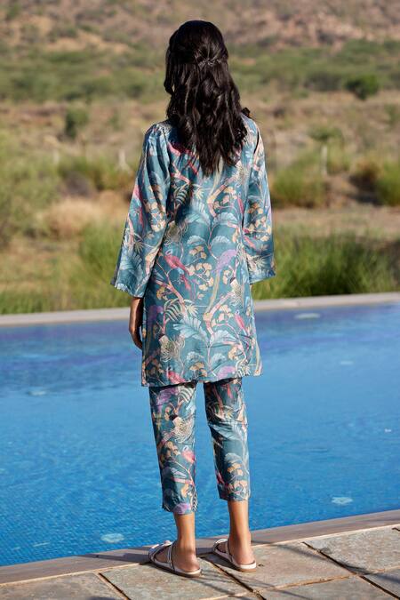 Teal tussar silk kurta featuring an all-over botanical print with bell sleeves and a V collar neck. Paired with straight fit printed pant, showcasing sequin and cut dana embroidery details.