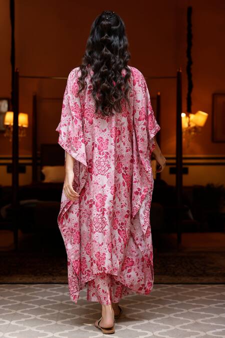 Pink floral printed kaftan featuring a U neck and embellished placket. Paired with a matching palazzo, it has kaftan sleeves and scallop bordered sleeve hems.