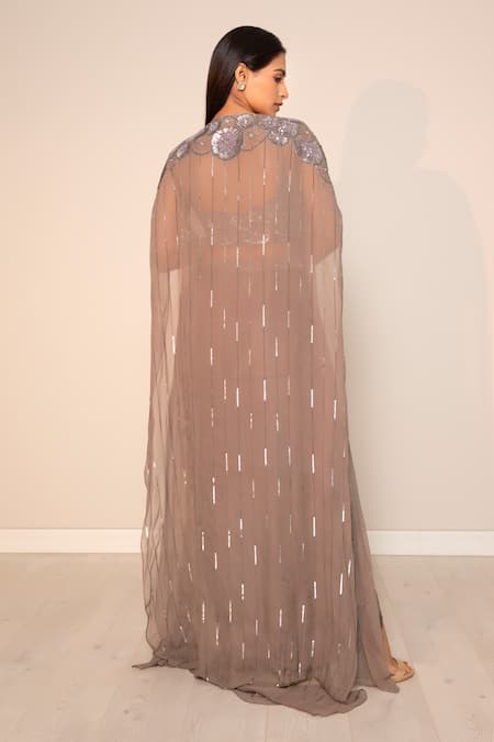 Green embroidered cape featuring floral sequin and cutdana work. Paired with an embroidered padded blouse and a draped skirt with pleats and gathers detailing.