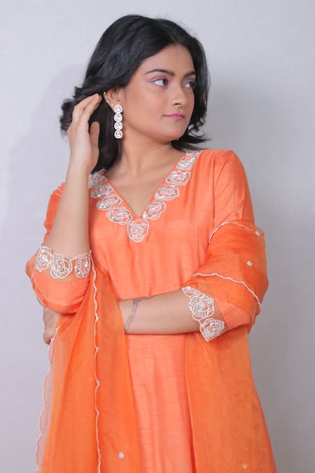 Orange Silk Organza Embroidered Resham V Neck Anarkali Pant Set