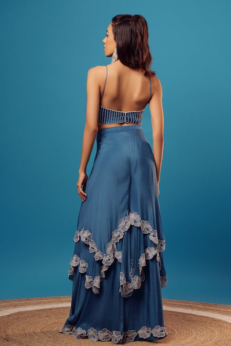 Blue crepe padded corset featuring cutdana hand embroidery. Paired with layered palazzo and an organza dupatta.