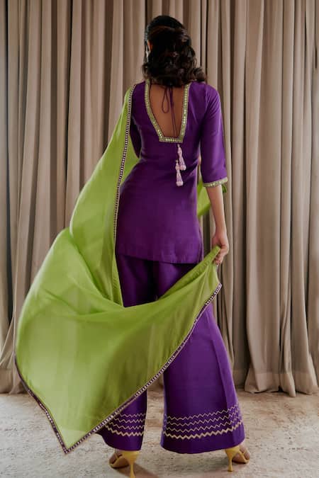 Purple silk kurta featuring a blunt V neck with mirror and kasab embroidery. Paired with a palazzo and a parrot green organza dupatta.